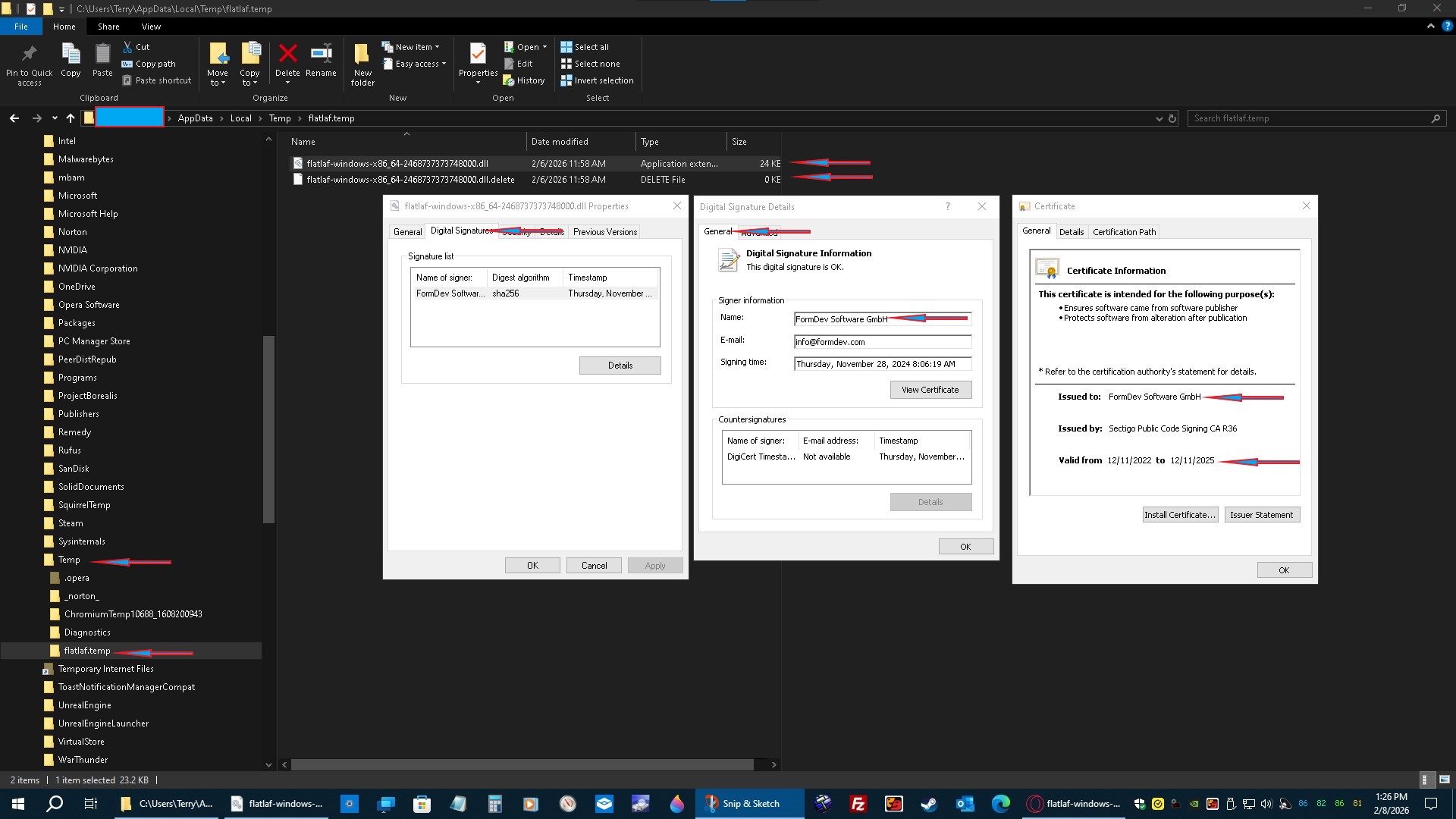 Has anyone seen this appear in the user/temp directory before, Windows 10 Pro? Found this when doing my daily system temp file cleaning on my daily duster. Nothing in Norton history as far as detections, BUT, this is an expired certificate for a valid ( supposedly ) Windows dll. How in the world the OS nor Norton did not disallow this from getting onto the OS is beyond reproach. This is dangerous to say the least. Feedback is a must please.