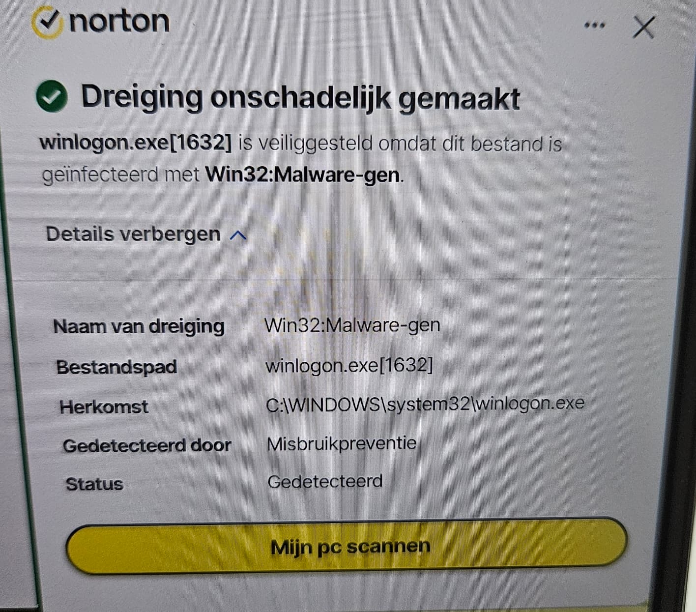 Detailed description: since a couple of months, i get the pop-up from the screenshot over and over again. The file is signed by MS. Scans of the system32 folder by Norton itself don’t bring anything up, as do scans by Windows defender, Malwarebytes and ESET. Also, submitting the file to Virustotal shows it as clean. The last scan of winlogon.exe there always shows up as recent, btw.
