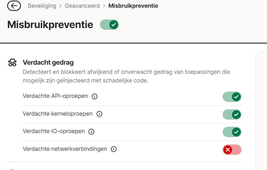 ‘Misbruikpreventie’ must be the prevention mentioned under security - advanced - ….prevention. I am now trying to see what disabling one (after another) setting there will do …